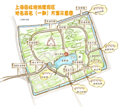 2015年4月8日,上海迪士尼项目区域的道路、河流、湖泊、桥梁、公共绿地、地铁站等6类24项基础设施的地名命名方案陆续获得审批通过上海国际旅游度假区 上海迪士尼  上海迪士尼度假区